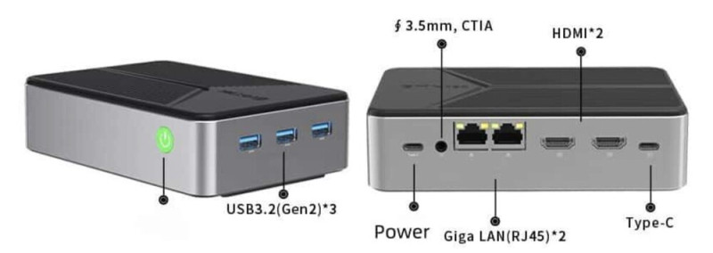 A legfeljebb 32 TB tárhelyet kezelő csöppség légrésekkel megtűzdelt készülékházán három USB 3.2 Gen 2 Type-A port, egy USB Type-C kapu, két HDMI kimenet, két 2,5 gigabites Ethernet, illetve egy 3,5 mm-es jack található a tápellátásért felelős, külső adapterhez tartozó USB Type-C konnektoron kívül.
