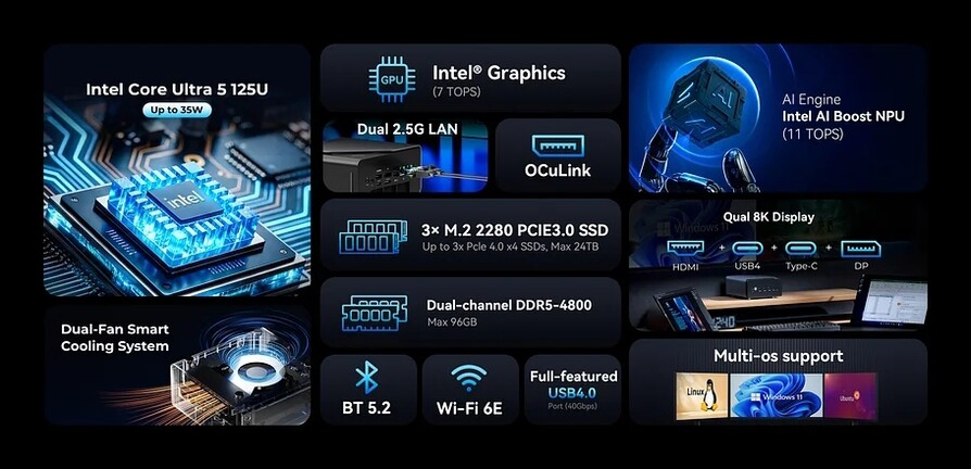 A 154 x 151 x 73,6 mm-es, utólag könnyedén bővíthető konstrukció központi egysége alapból 15 wattból gazdálkodik, ám fogyasztási keretét 35 wattig tolhatjuk ki, míg a legfeljebb 5600 MHz-es effektív órajelen ketyegő rendszermemóriából 96 GB jelenti a plafont a két SO-DIMM DDR5 slotnak hála. A három rendelkezésre álló, PCI Express 4.0-s M.2 2280 aljzatból az egyik támogatja a SATA-s meghajtókat is, a tárolók pedig egyenként maximum 8 TB-osak lehetnek. A két, Realtek 8125BG kontrollerek által vezérelt, 2,5 gigabites Ethernetet MediaTek MT7922-es Wi-Fi 6E/Bluetooth 5.2 modul egészíti ki a hálózati fronton, és az alkatrészek hűtéséről egy két hővezető csövet, plusz két ventilátort – melyek közül egy RGB világítást kapott – felvonultató, portól védett rendszer gondoskodik.
