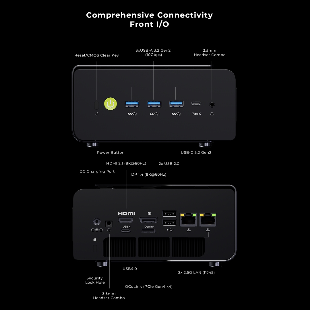 A VESA rögzíthetőséget kínáló masina előlapján egy Reset/Clear CMOS gomb, egy 100 wattnyi kakaót közvetítő, DisplayPort alt módos USB 3.2 Gen 2 Type-C kapu, három USB 3.2 Gen 2 Type-A konnektor, valamint egy 3,5 mm-es kombójack állomásozik, miközben a hátulján egy 2.1-es HDMI kimenet, egy 1.4-es DisplayPort, egy szintén 100 wattos USB4 Type-C csatlakozó, egy második kombójack, két USB 2.0 port és egy négy PCI Express 4.0 sávot biztosító OCuLink interfész sorakozik a két LAN-on felül.