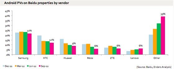 Az alábbi, Enders Analysistól származó ábra a kínai Baidu keresőre befutott, valamilyen Android-alapú operációs rendszerről indított lekérések gyártók közötti megoszlását mutatja 2011. decembere és 2012. szeptembere között. Ahogy korábban már írtunk róla, a Samsung az első helyen, a többi nagyobb gyártó pedig jócskán lemaradva követi. Amitől ez a statisztika igazán érdekes, az a magenta színű oszlop alakulása – ez mutatja az „egyéb” gyártóktól érkező lekérdezéseket, ami háromnegyed év alatt megduplázódott.