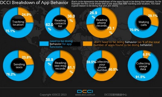 A napokban a Kínai Internetes Adatközpont is kiadott egy elemzést, melyben az 1400 legnépszerűbb Android app vizsgálatának eredményeit ismerteti. Az intézet munkatársai a kutatás végeztével arra az eredményre jutottak, hogy a vizsgált programok 66,9 százaléka fért hozzá valamilyen módon a felhasználó személyes adataihoz, és 34,5 százaléka olyan információkat gyűjtött, amihez az adott programnak a funkciói alapján egyáltalán nincs köze. A jelentés szerint ezek az appok gyakorlatilag válogatás nélkül vadásszák az információt – beletúrnak az üzenetekbe, a híváselőzményekbe, a névjegyzékbe. Az alábbi grafikonon látható adatok nem festenek rózsás képet a kínai alkalmazáspiacról, de talán a kéretlen üzenetküldés, a hívásindítás és az üzenetek elolvasásának magas aránya a legzavaróbb.