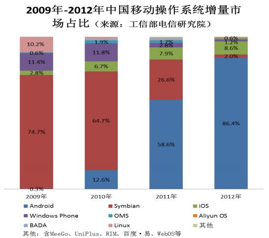 Okostelefon operációs rendszerek részesedésének alakulása Kínában 2009 és 2012 között - forrás: Gartner