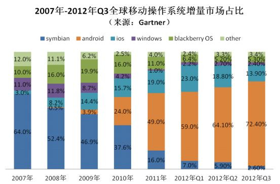 Okostelefon operációs rendszerek részesedésének alakulása globálisan 2007 és 2012 Q3 között - forrás: Gartner