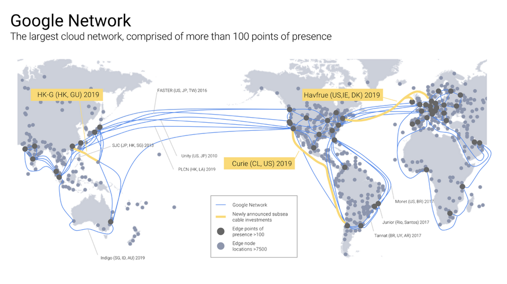 A kábelépítéseket 2019-re tervezik. A Curie nevű Chilét és Los Angelest köti majd össze, ez a Google saját projektje. A Havfrue nevet kapott kábellel az Egyesült Államokat, valamint Írországot és Dániát kapcsolják össze, míg Hong Kong-Guam (HK-G) kábel ázsiai csomópontok között épül ki – az utóbbi kettőt a Google konzorciumok tagjaként valósítja meg, a Havfrue-ba például a Facebook is beszállt.