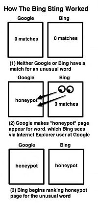 Hogy ezt a sejtésüket bizonyítsák, „csapdát” készítettek: körülbelül száz „mesterséges lekérdezést” hoztak létre a kísérlethez. Ezek nagyon ritkán használt vagy egyáltalán nem létező keresések voltak (pl. hiybbprqag), és ezekhez a könnyebb ellenőrizhetőség végett manuálisan állították be az első tíz találatot, amelyeket semmiképp nem kaphattak volna egyébként meg, mivel nem volt semmi közük a kereséshez. Majd 20 mérnöküknek adtak egy-egy laptopot, amelyen frissen telepített Windows futott, a böngészéshez pedig az Internet Explorer 8-at használták a Bing eszköztárral kiegészítve, és bekapcsolták az oldalajánlót is. A résztvevők dolga ezek után az volt, hogy a Google főoldalán rendszeresen keressenek rá a kijelölt 100 kifejezésre. Azt tapasztalták, hogy míg a teszt indítása előtt a két kereső teljesen más első találati oldalt adott, addig a próba kezdete után nem sokkal a Bing bizonyos esetekben a Google eredményeit kezdte kiadni.