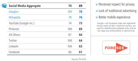 Ugyan a Google+ a regisztrációk számában meg sem közelíti a Facebookot, a meglehetősen érzékeny területként kezelt fogyasztói elégedettséget vizsgáló ForeSee kapott eredménye alapján a felhasználók sokkal jobban szeretik, mint a királykék konkurenciát. Az új belépő 100 pontból 78-at kapott az American Customer Satisfaction Indexen (Amerikai Vásárlói Elégedettségi Mutató, ACSI), ami az ellenfél idei (61) és tavalyi (66) eredményeit is felülmúlja.