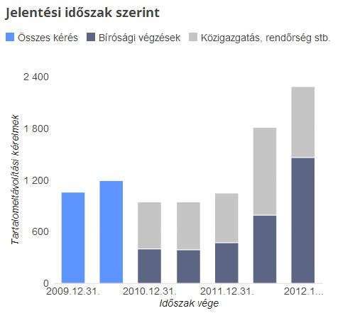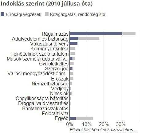 A 2012 július és december közötti időszakban 2285 kormányzati kérés érkezett a Google-hoz, 24 179 különböző tartalom törlését kérve, ami jelentős növekedés az előző félévhez képest (akkor 1811 kérés érkezett 18 070 kifogásolt tartalom törlésére). Az adatokat nézve sajnos egyre népszerűbb gyakorlat a kormányzati szervek körében, hogy olyan anyagok eltávolítását kérjék, melyek az aktuálisan kormányzó politikai erő(ke)t kritizálják. Sőt, nagyobb részben nem csak kérés, hanem bírósági határozat érkezett a Google-hoz. A 2010 júliusa gyűjtött adatok alapján a legnépszerűbb ok (toronymagasan) a rágalmazás, nagyjából feleennyi esetben adatvédelem és biztonság miatt keresik meg a Google-t.