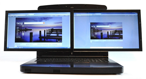 Biztosan emlékeznek még kedves olvasóink a Lenovo ThinkPad W700ds-re, aminek oldalából kisebb, másodlagos kijelzőt lehetett kihajtani. A második képernyő hasznos lehet grafikai vagy CAD tervezői munkánál, de sok más területen is jól jön még egy monitor. Az amerikai gScreen alapítója a Lenovonál merészebben álmodta meg ezt a koncepciót, és egyesek számára eszementnek tűnő tervéből valóság lett. A SpaceBook 17-nek két 17,4 hüvelykes, Full HD felbontású képernyője van. A vaskos, 4,5 kilogrammot nyomó masina használható egyszerű notebookként is, de ha szükségünk van rá, egy elmés mechanizmussal kihajthatunk mellé még egy LCD-t. A hatcellás akkumulátort és többi hardverelemet úgy helyezték el, hogy ne billenjen hátra a dupla monitoros csoda.