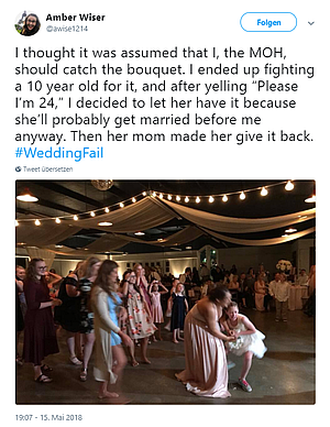 Azt hittem, hogy nekem, mint koszorúslánynak illik elkapni a csokrot. Végül egy 10 éves kislánnyal harcoltam érte, miután azt kiabáltam: „Én kérem, én 24 éves vagyok!” Végül úgy döntöttem, elengedem, mert valószínűleg így is előbb veszik őt feleségül. Végül az anyja odaadta nekem a csokrot. |