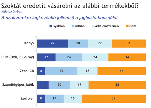 A vizsgálat rákérdezett arra is, hogy mely termékcsoportokból szoktak eredetit vásárolni a diákok. A firtatott kategóriák közül (könyv, film, zenei CD, játékprogram, szoftver) a legritkábban szoftverre adnak ki pénzt. A tanulók 59 százaléka mondta azt, hogy nem vásárol eredeti szoftvert, és csupán 8 százalék választotta a „gyakran” választ. A nem vásárlók aránya a számítógépes játékok esetében is 50 százalék felett van. A legnagyobb hajlandóság az eredeti „termék” megvásárlására a könyveknél van (29% gyakran vesz).