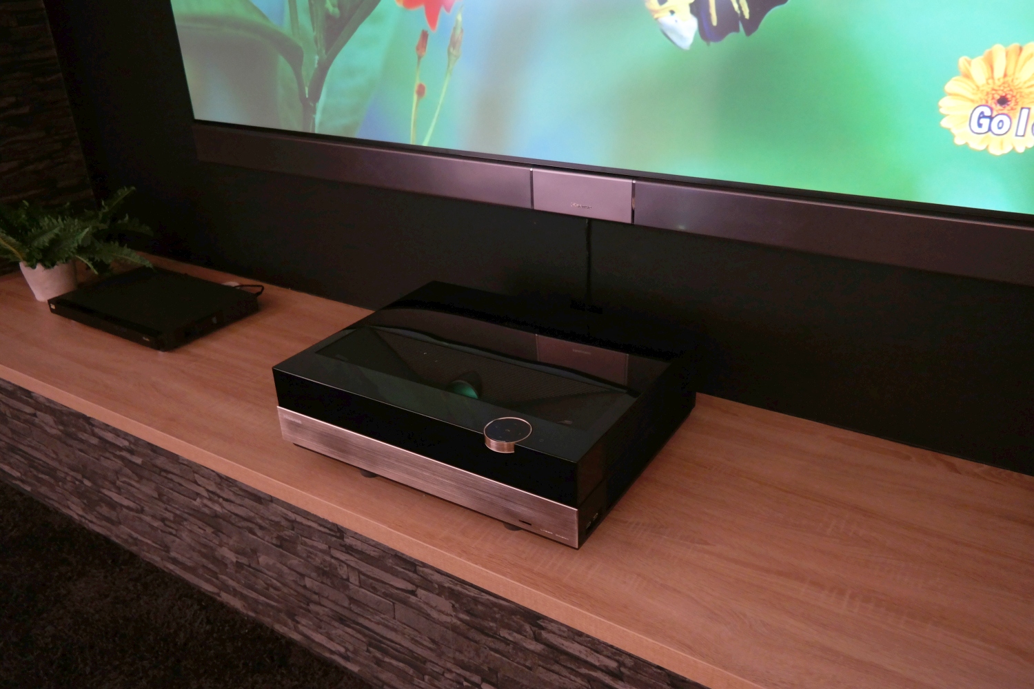 Ezért a viszonylag magas összegért egy olyan projektor jár, amely 30 centiméterről 100 hüvelykes kép kivetítésére képes. Ehhez szükség van egy speciális vászonra is, ez azonban a termékkel együtt jár. A kép minősége teljesen jónak tűnt, a színek szépek, természetesek voltak, és a mozgásmegjelenítéssel sem akadt probléma, bár azért a Full HD felbontása ma már, legalábbis ennyi pénzért egy kicsit karcsú. A maximális fényerejéről annyit árultak el, hogy működés közben olyan, mint egy 350 cd/m² fénysűrűségre képes tévét nézne az ember, ami papíron elégnek tűnik.A "vászon" alján található egy integrált hangprojektor, és a készülék mellé egy vezeték nélkül csatlakoztatható mélynyomót is adnak.