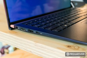 A kijelző természetesen a NanoEdge fantázianévvel rendelkező, vékony keretes kialakítással bír és Full HD felbontású, 100%-os sRGB és 72%-os NTSC lefedettséggel, illetve a Pantone tanúsítványával, amely a DeltaE<2 színhűségért jár. Hálózati adapterként IEEE 802.11ac-s Wi-Fi adapter került a gépházba, kívül pedig egy 10 és egy 5 Gbps sebességű USB 3.1 portot (előbbit Type-C, utóbbit Type-A konnektorral), egy USB 2.0 csatlakozót, HDMI-t és négypólusú kombinált jack aljzatot találhatunk. A 70 Wh-s akkuval az ASUS 12,5 órás maximális üzemidőt ígér, mindezt pedig egy 323 x 225 x 18 mm-es csomagba sikerült elrendezni, 1,6 kg-os tömeggel.