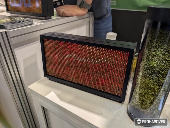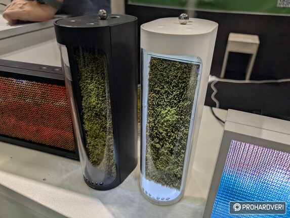 A három kiállított termék közül még talán a 70 eurós Moss Air névre hallgató szűrő/párásító tűnt a leginkább használhatónak, hiszen ez tényleg a nyirkosan tartott moha segítségével párásítja, CO2-mentesíti és szűri a levegőt, bár kis mérete (25 cm magas és körülbelül 10 x 7,5 cm az alapterülete) miatt tökéletes kiegészítője lehet asztalunkon egy ARGB-s, akvárium stílusú PC-nek, ám egy átlagos szoba atmoszférájának karbantartására már kevés. Víztartálya 320 ml-es, és óránként 40 ml-nyi vizet képes a levegőbe juttatni. Szűrője élőlény, tehát rendszeres gondoskodást igényel, persze nem igazán sokat, elég naponta egyszer egy kevés vizet spriccelni rá. Élettartama egyébként meglepően hosszú is lehet, ha odafigyelünk rá és gondját viseljük, évekig nőhet a moha a panelen, de természetesen könnyedén cserélhető az egész, ha valamiért idő előtt elpusztulna élő légszűrőnk.