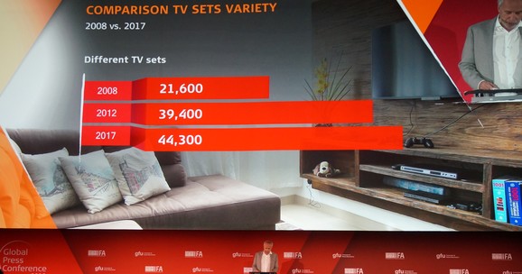 Az IFA Global Press Conference 2018 eseményen többek között a GfK piackutató cég is tartott egy monstre előadást. Ebben a trendek, globális piaci folyamatok és előrejelzések mellett azt is bemutatták, hogy tavaly mekkora volt egész televíziós piac kínálata, vagyis összeszámolták az összes gyártó, összes márka összes létező méretű, színű modelljét, hogy így reprezentálják a választék nagyságát. A kérdésünk az, hogy szerintetek 2018-ban a világ minden pontját beleértve, és a régebbi, de még elérhető modelleket is beleszámítva hány különféle típusú televíziókészüléket árultak? A választ egy hét múlva közöljük, addig szavazzatok bátran!
