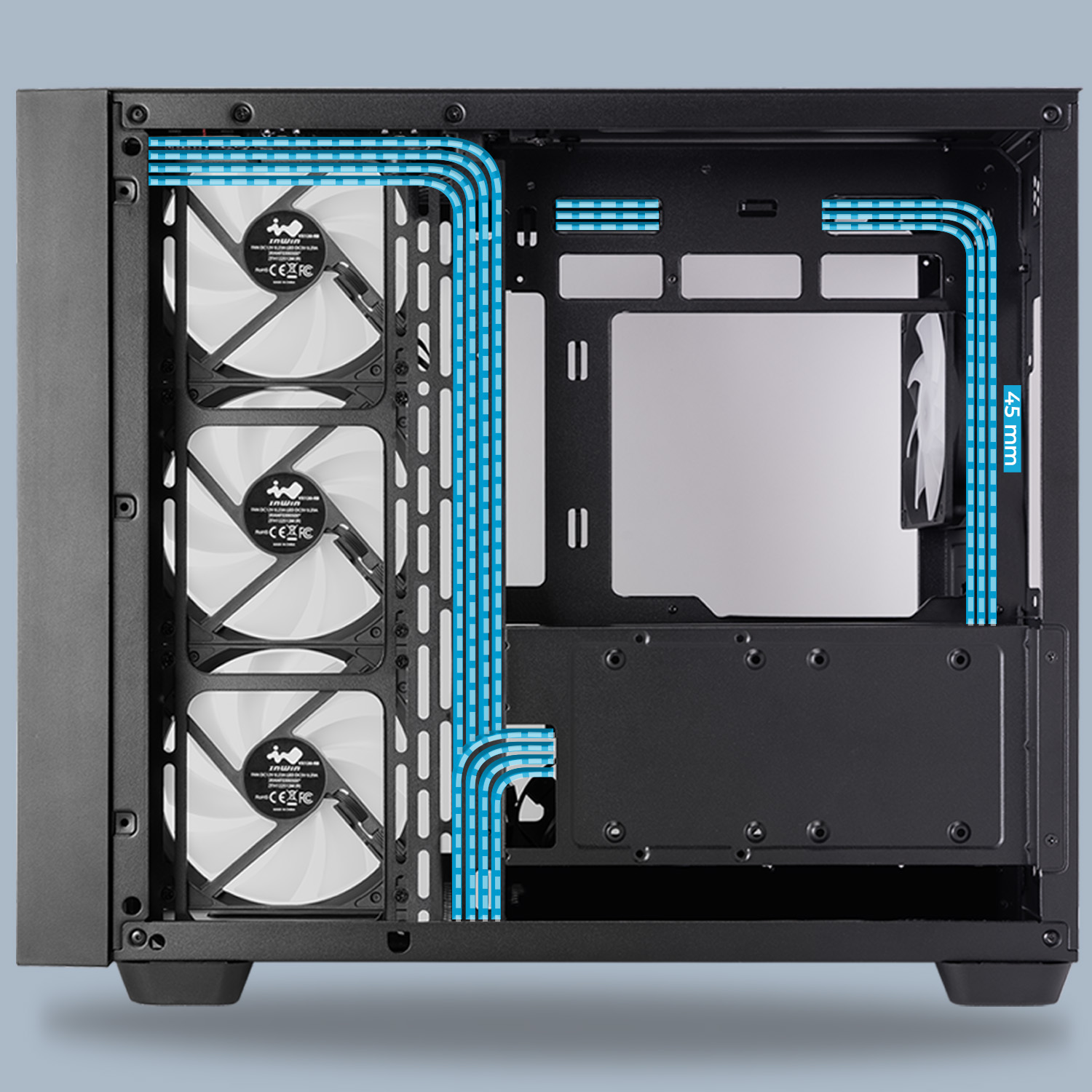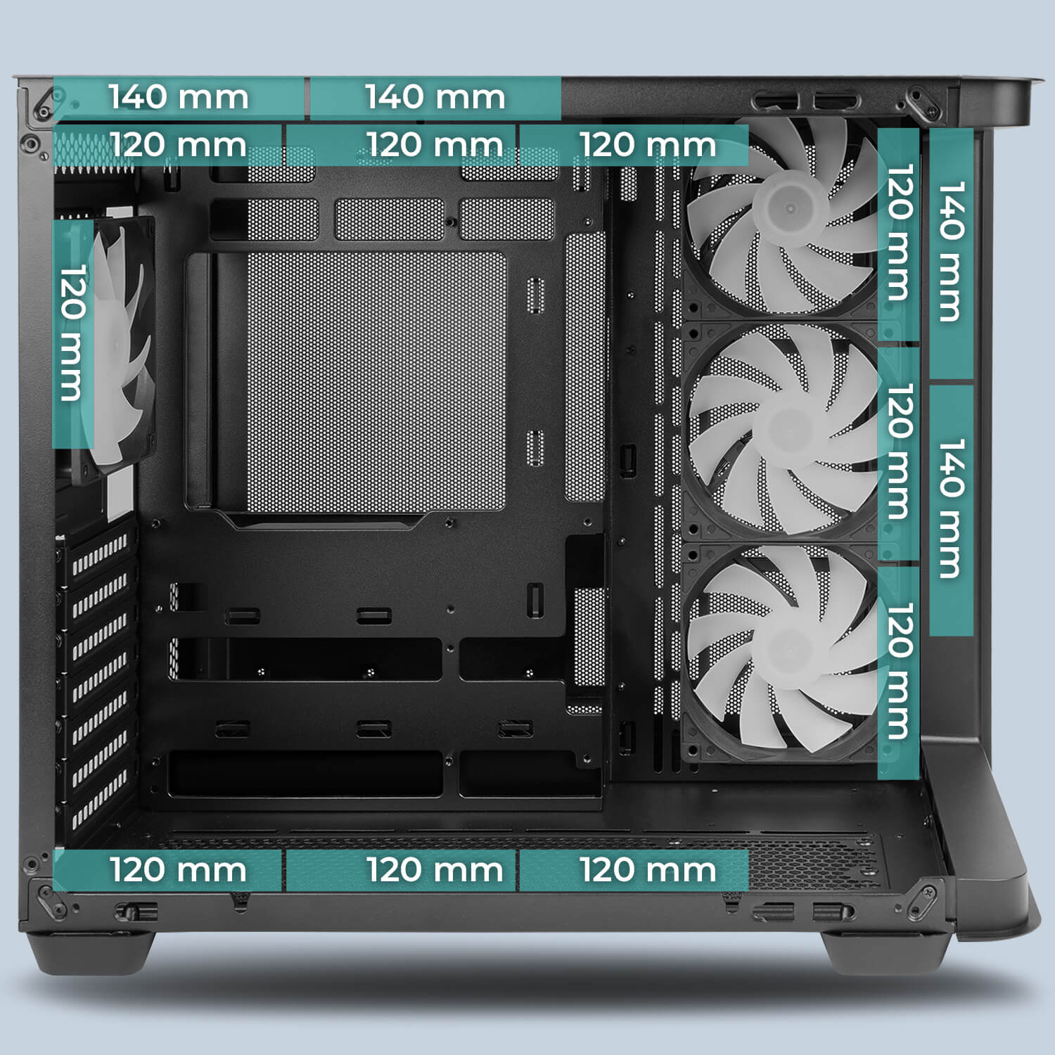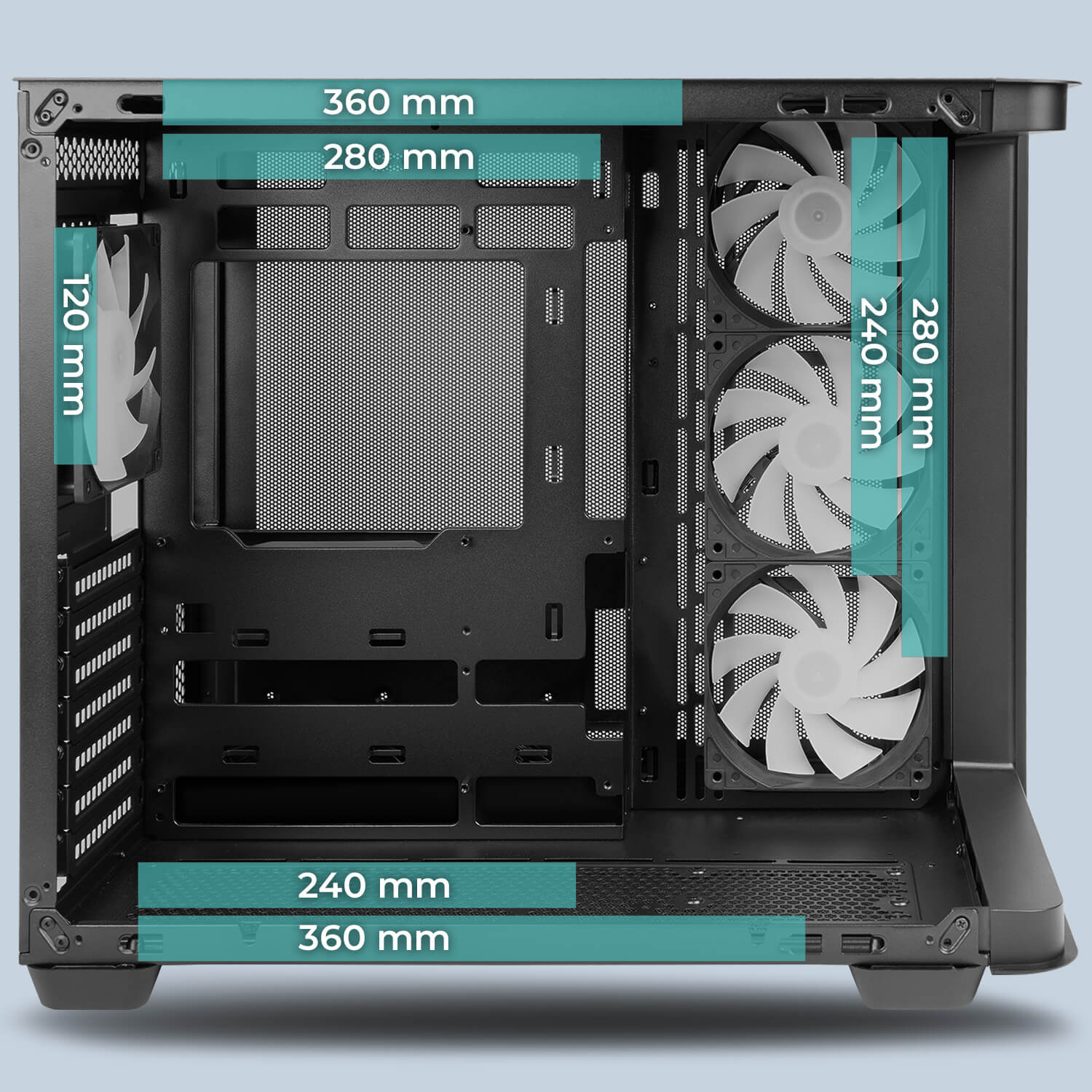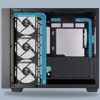 A 120 x 120 x 25 mm-es, ARGB LED-ekkel ellátott – folyadékcsapágyas – léghajtókkal érkező géplak természetesen nem hanyagolja el a vizes rendszerek gazdáit sem, hiszen négy radiátor beépítésének lehetősége biztosított, ráadásul ezekből kettő 360, egy pedig 280 mm-esre nőhet. Alkatrészeink tisztaságára alul-felül mágneses porszűrő betétek vigyáznak, és a hőmenedzsmentet nagyban segíti, hogy a jobb oldalon nyugvó acélpanelt szinte teljes egészében fémháló alkotja. Az alaplapi tálca mögött bőséges, 45 mm-es szélességű térrészünk van a vezetékrengeteg elfésülésére, és a tetőlemez jobbján sorakozó előlapi kivezetések mezőnyében egy USB 3.2 Gen 2x2 Type-C kaput, két USB 3.2 Gen 1 Type-A aljzatot, továbbá két, 3,5 mm-es jacket találunk.