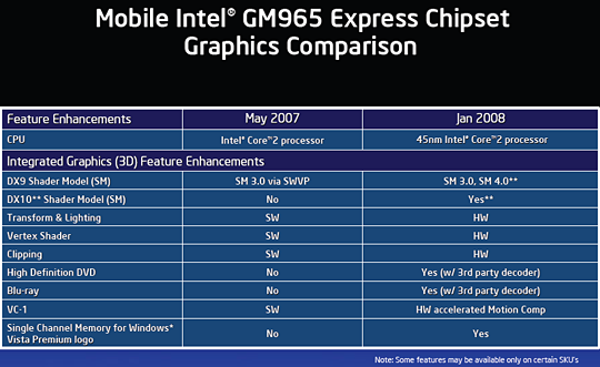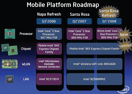 A Santa Rosa Refresh néven futó mobil platform, hivatalos nevén Centrino processzortechnológia fő újdonsága a Penryn magos, hatékonyabb energiagazdálkodással, teljesítményfokozó újításokkal, átlagosan magasabb órajelekkel és nagyobb másodszintű gyorsítótárral bíró Core 2 processzorok bevezetése. Mindegyikük, még az Extreme változat is kétmagos, és már e hónapban megjelenhetnek az újabb noteszgépekben. Megújul a GM965 lapkakészlet is, a hardver, de még inkább az illesztőprogram képességei HD-videók lejátszásának támogatásával, illetve – az ígéret szerint még ebben a negyedévben – Shader Model 4.0-támogatással egészülnek ki.