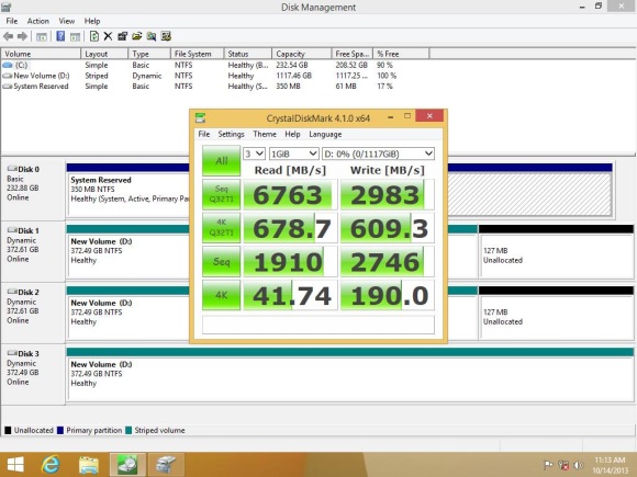 A PCI Express kártya formátumú tárolóból három került a Gigabyte alaplapba szoftveres RAID tömbben, és már jöhettek is a benchmark mérések. Nemrégiben mértünk 1400 MB/s körüli olvasási és 700 MB/s körüli írási tempót a Kingston HyperX Predator SSD-jével, ami a korábbi modellekhez képest űrsebességnek számít, de a három Intel közös produkciója mellett eltörpülnek ezek az értékek is.