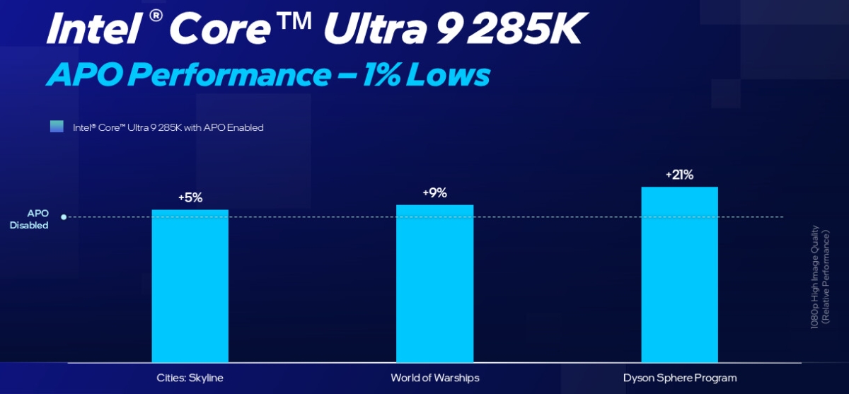 Az Intel még a Raptor Lake-S Refresh termékcsalád bemutatásával párhuzamosan vezetett be egy szoftveres fejlesztést, nevezetesen az alkalmazásoptimalizációt. Ez bővebben Application Performance Optimizer, azaz APO néven fut, és a lényege annyi, hogy segíti a szálak optimális ütemezését az eltérő teljesítményű magokon. Mivel az Arrow Lake-S generáció is ugyanilyen magkoncepció szerint készül, így a program erre a sorozatra is hasznos, sőt, alapvetően szükségszerű, mert másképp nem lehet kihozni az érintett processzorokból a legjobb teljesítményt.