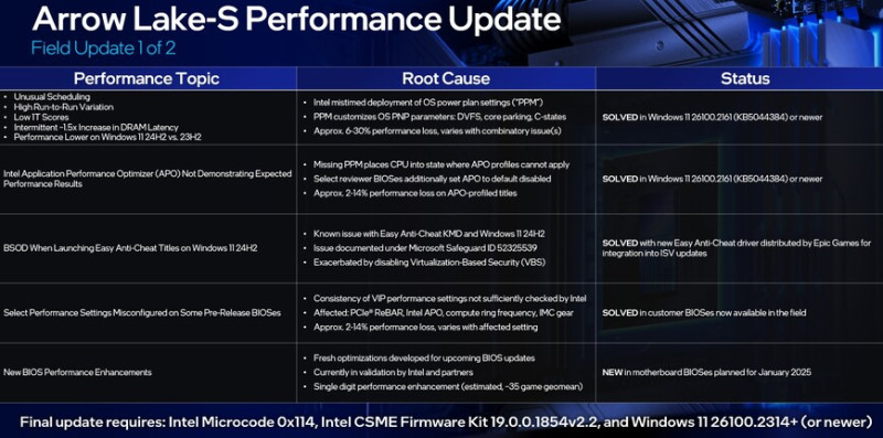 Az Intel szerint négy gondot felszámoltak, így Easy Anti-Cheat szolgáltatást használó játékok már nem fagynak, mivel megkapták a szükséges programfrissítéseket, a Windows 11 KB5044384-es frissítés által az APO, illetve a PPM is helyrejött, míg az újabb, már elérhető BIOS-okban jó az alapértelmezett konfigurálás.