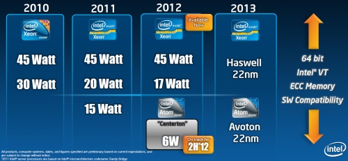 Az Intel Centerton kódnevű, szerverekbe szánt Atom processzorról már az elmúlt év végén írtunk először. A korábbi adatok úgy néz ki, hogy helyesnek bizonyulnak, és a termék is elstartol az év második felében. Az Intel ezt egy hivatalosan bemutatott útiterv formájában erősítette meg, ahol azt is elmondták, hogy a mikroszerverek szempontjából az igények nagyon tág határok között mozognak, és egyértelműen előnyös bizonyos területeken az Atom processzor alkalmazása. Az Intel ezt korábban nem így látta, de Jason Waxman szerint az igényeket a piac szabja, és ezeket le kell fedni.