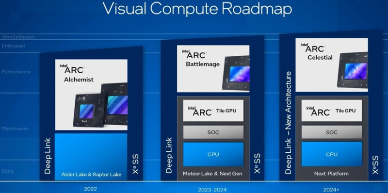 A kliensoldali fejlesztéseknél viszonylag egyszerű a helyzet, ugyanis még idén jön az Alchemist kódnevű Arc GPU-sorozat, illetve az Alder Lake-et váltó Raptor Lake generáció. A 2023-2024-es időszakra a vállalat a Battlemage kódnevű GPU-kat tartogatja, a processzorok tekintetében pedig a Meteor Lake-re, illetve ennek a kódnév nélkül jelzett továbbfejlesztésére lehet számítani. 2024-en túl érkeznek majd az Arc termékcsaládba a Celestial kódnevű GPU-k, platformszinten pedig egy olyan processzorral készülnek, aminek még nem adtak kódnevet, annyit viszont tudni, hogy ezek már új architektúrát használnak.