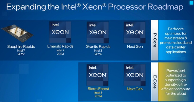 A fenti dizájnok mindegyike P-Core-ra épít, vagyis nagy teljesítményű magokat használ, viszont 2024-ben érkezik a Sierra Forest kódnevű fejlesztés is, amely E-Core-okat, azaz energiatakarékos működére optimalizált magokat alkalmaz, és a Granite Rapids dizájnnal megegyező gyártástechnológiára épít. A PROHARDVER! olvasói számára ez sem lehet ismeretlen, mivel múlt novemberben már írtunk róla.