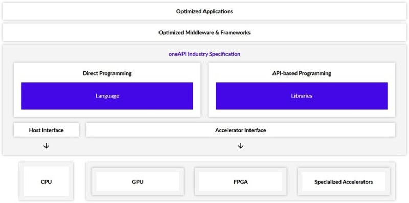 A oneAPI fő komponense a Data Parallel C++ nevű nyelvvariáns, amivel gyakorlatilag programozhatók az eltérő hardverek, a CPU-któl kezdve a különböző gyorsítókig. Ezzel a kód újrahasznosíthatósága igen magas lehet, miközben a rendszer azért megadja a lehetőséget a hardverspecifikus optimalizálásra is. Maga a Data Parallel C++ a SYCL-re épül, ami a Khronos Group platformfüggetlen absztrakciós rétege. Ez biztosítja azt flexibilis alapot, hogy egyetlen C++ forrásból megoldható legyen maga programfejlesztés.