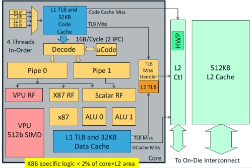 A magok tekintetében igazából alapvetően az eredeti Pentium in order szuperskalár dizájnja köszön vissza, de a MIC magok azért mások, hiszen négy szálon dolgoznak, illetve a lebegőpontos egység 512 bites, de ezt az Intel már korábban elárulta. Az L1 adat és utasítás cache 32-32 kB-os, emellett a cég megjegyezte, hogy az x86-tal kapcsolatos részek a processzormag kiterjedésének kevesebb mint 2%-át emésztik fel, beleszámolva a megosztott másodlagos gyorsítótár magnak járó szeletét. Fontos azonban megemlíteni, hogy a Larrabee-ből kialakított MIC architektúra annyira különbözik a hagyományosnak tekinthető x86/AMD64-es processzoroktól, hogy az x86-os programokkal való bináris kompatibilitás nem lehetséges. Ez persze nem gond, hiszen a Xeon Phi egy gyorsítókártya, és több szerepet nem is szán neki az Intel.