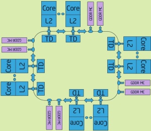 Knights Cornerben összesen 10 gyűrűs busz van, 5-5 egy-egy irányban. A buszok a másodlagos gyorsítótárakat kötik össze, egy-egy megállóval, és az adat órajelenként egy megállót vándorol. Az 5-5 gyűrűs buszból 1-1 a BL busz, ami 512-512 bit széles. Ez a busz szállítja az adatokat. A többi 4-4 busz közül 2-2 az AK, míg 2-2 az AD jelzést viseli, előbbiek a koherenciát biztosító információkat, utóbbiak pedig a memóriacímeket szállítják. Az Intel a Knights Ferry esetében feleannyi AK és AD buszt használt, és ez eléggé limitálta a skálázhatóságot. A MIC magok 32 MB-os megosztott L2 gyorsítótárat használnak MESIF koherencia-protokollt alkalmazva, vagyis mindegyik mag olvashatja a teljes gyorsítótárat, de csak a saját 512 kB-os szeletükbe írhatnak. Mindegyik maghoz kapcsolódik még egy úgynevezett TD (tag directory), amelyek logikailag nincsenek kirendelve a magokhoz. Alapvetően egyetlen egységről van szó, mely arra szolgál, hogy ha szükség van egy adatra, akkor a TD-t lehet erről megkérdezni. Ha az adat megtalálható az L2 tárban, akkor a TD megmondja, hogy hol van, ellenkező esetben a fedélzeti memóriához kell fordulni, hiszen a kívánt információ ott található. Ez egy nagyon fontos dolog az architektúrán belül, mivel a legtöbb HPC munkafolyamat blokkosított algoritmusokat használ, ha ezek méretét az L2 gyorsítótárhoz szabják a programozók, akkor elég hatékonyan működhet a Knights Corner.