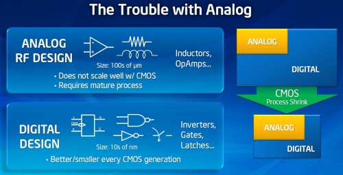 Az Intel már tíz éve is kacérkodott a gondolattal, hogy a minden eladott processzornak tartalmaznia kellene rádió adó-vevőt. Ezt az álmot még 2002-ben vázolta fel Pat Gelsinger, aki már nem dolgozik az Intelnél, de az álom ettől még megmaradt. A Wi-Fi modul integrálásával egy nagyon nagy probléma van. Maga a rendszer többnyire analóg elemekből épül fel, ami megakadályozza a skálázhatóságot. Ez az oka annak, hogy ezek a termékek még mindig viszonylag régi gyártástechnológiára épülnek, hiszen Moore törvénye nem alkalmazható rajtuk. Az integrálás tehát ebből a szempontból lényegtelen, hiszen függetlenül attól, hogy a csíkszélesség csökken az analóg rész nem fog vele skálázódni.