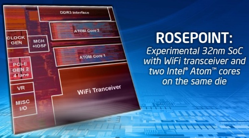 Az integráció szempontjából az Intel egy Rosepoint kódnevű fejlesztéssel állt elő, mely 32 nm-es gyártástechnológián készül, és a két darab Atom mag, illetve az integrált memóriavezérlő, valamint a többi részegység mellé bekerült egy Wi-Fi rádió adó-vevő. A Rosepoint azonban egyelőre csak prototípus, hiszen az Intel elmondta, hogy az elkövetkező két évben biztos nem kerül kereskedelmi forgalomba a termék, ráadásul manapság komoly limitációnak számít, hogy csak a 2,4 GHz-es sávot támogatja. A Rosepoint lapkán egyébként látható, hogy elég sok helyet foglal el a Wi-Fi modul. Az arányok ugyan a következő generációs gyártástechnológiánál is megmaradnak, de akkorra lesz hely ennek az egységnek.