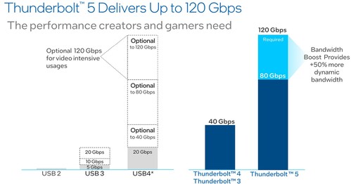 Röviden marad az USB Type-C csatlakozó, ennek hála az USB 2.0, az USB 3.2 (5, 10 és 20 Gbps), az USB3/DP az USB4, illetve a Thunderbolt 3 és 4 interfészre tervezett eszközökkel megmaradt a kompatibilitás, és ehhez most hozzájön a Thunderbolt 5. A rendszer megfelel az USB4 specifikációinak, továbbá más protokollt is támogat, például DisplayPort 2.1-et, Ethernetet és PCI Express 4.0-t.