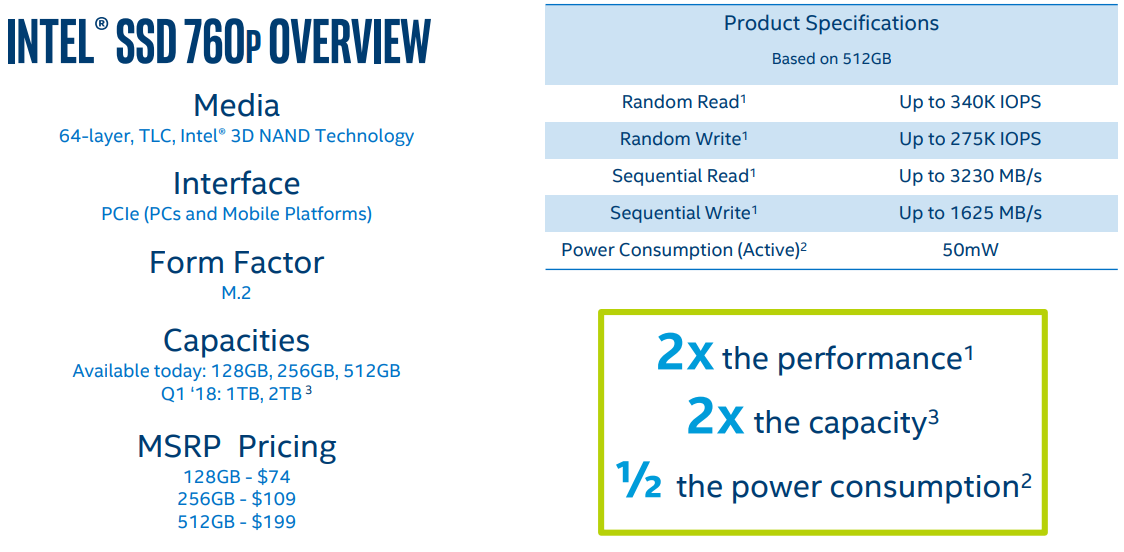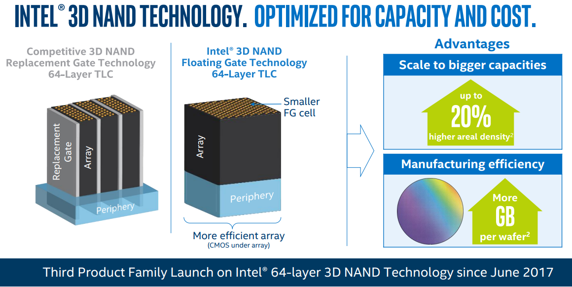 A frissítés az Intel saját 64 rétegű TLC 3D NAND-jára épül, vezérlőként a Silicon Motion 2262-t használja, és minden újítással együtt, állítólag az elődhöz viszonyítva, akár kétszeres sebességnövekedést, fele akkora fogyasztást, illetve a nagyobb adatsűrűségnek köszönhetően a SATA meghajtók árszintjét megközelítő költségeket ígér. Az M.2 formátumban érkező, AES 256 bites titkosítást kínáló meghajtók kapacitása 128 GB és 2 TB között lesz, a maximális szekvenciális olvasási tempó 3230, az írásit pedig 1625 MB/s-ban adja meg az Intel, míg a véletlenszerű hozzáférés esetén 340 000 és 275 000 IOPS a releváns.