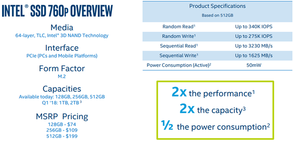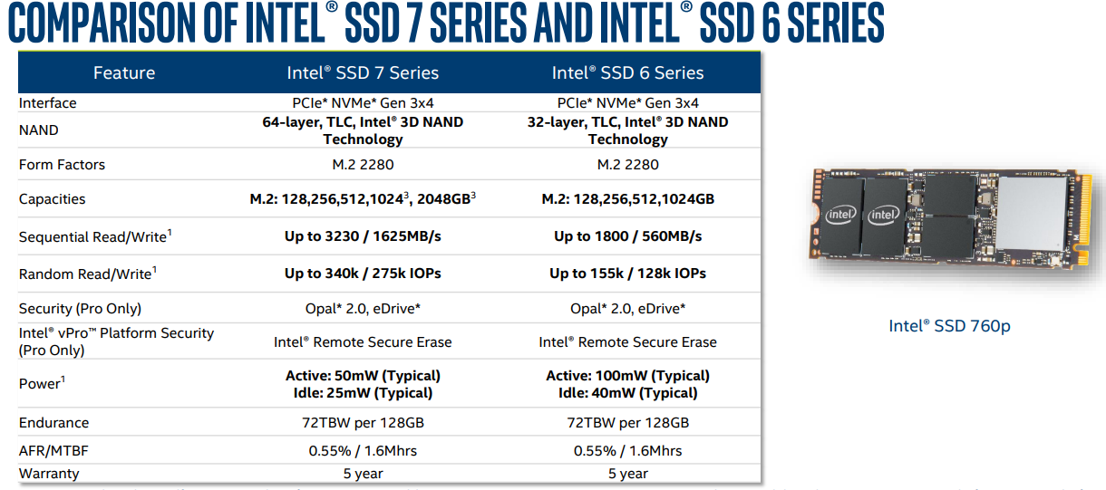 A 760p széria mellé érkezik az üzleti felhasználásra szánt SSD Pro 7600p is, megegyező specifikációkkal, de extraként az Opal 2.0, eDrive és vPro-val párosítva a Remote Secure Erase is használható. A terhelhetőség 128 GB-onként 72 TBW, a garancia tekintetében pedig öt évet vállal a cég.