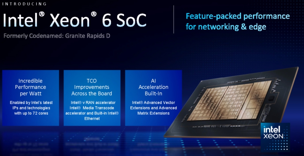 A fentieknél érdekesebb megoldás a Granite Rapids-D kódnevű platform, ami a Xeon 6 SoC sorozat része. Ez egy IO, illetve két darab Redwood Cove kódnevű P-magokat tartalmazó chipletből áll, továbbá négycsatornás DDR5-ös memóriavezérlőt kínál, ráadásul némelyik modellben aktív a Media Transcode Accelerator, ami videotartalmakat képes transzkódolni valós időben. Az Intel szerint a teljes dizájn 72 magig skálázódik majd, ami fontos, mert a fő ellenfélként az AMD-féle Siena platform van megjelölve, de jelenlegi csúcsmodellben még csak 42 mag található. Az érkező processzorok paramétereit az alábbi táblázat részletezi:
