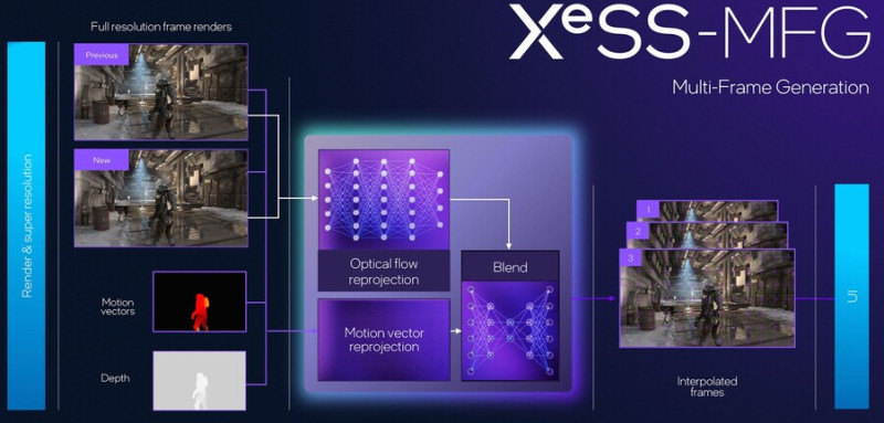 A technika háttere nem változott meg, így két valóban kiszámolt képkocka mellett történik a munka, és a generált képkockák a kettő közé kerülnek beszúrásra. Ezek száma egy, kettő vagy három lehet. Tehát az XeSS-MFG a leggyorsabbnak számító x4 módban két valós képkocka közé hármat generál.