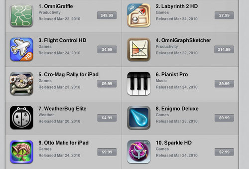Közzé tették az iPad megjelenésekkor elérhető, kimondottan iPad-es játékok listáját. Ezek elsősorban az iPhone és iPod Touch játékok korszerűsített, HD-sített verziói. Ami talán kellemetlenül érinthet néhány vásárlót, hogy jóval drágábban lehet majd ezeket beszerezni. Többek között a Flight Control HD 4.99 dollárba kerül majd, míg az iPhone változat mindössze 0.99 dollár. De az Enigmo Deluxe-ért is jóval többet kérnek, 2.99 dollár helyett 9.99 dollárt. Bár ezek nem biztos, hogy a végleges árak, az április eleji megjelenésig még van idejük korrigálni.