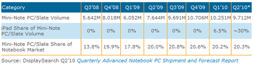 A legerősebb, 56,4 százalékos növekedést a netbookok és táblagépek kategóriájában regisztrálta a piackutató, amely e két viszonylag új terméktípust egy kalap alá veszi. De – állítják – a trend az iPad és az ahhoz hasonló tabletek gyors térnyerése lesz. Az iPad ugyan csak áprilisban, tehát a második negyedévben jelent meg, de az Apple már az első trimeszterben közel 700 ezer darabot szállított le belőle, hogy felkészüljön a premierre. Ezzel a netbook/tablet kategóriában 6,5 százalékos részesedést szerzett, melyet a második negyedévben várhatóan 30 százalékra tud majd növelni.