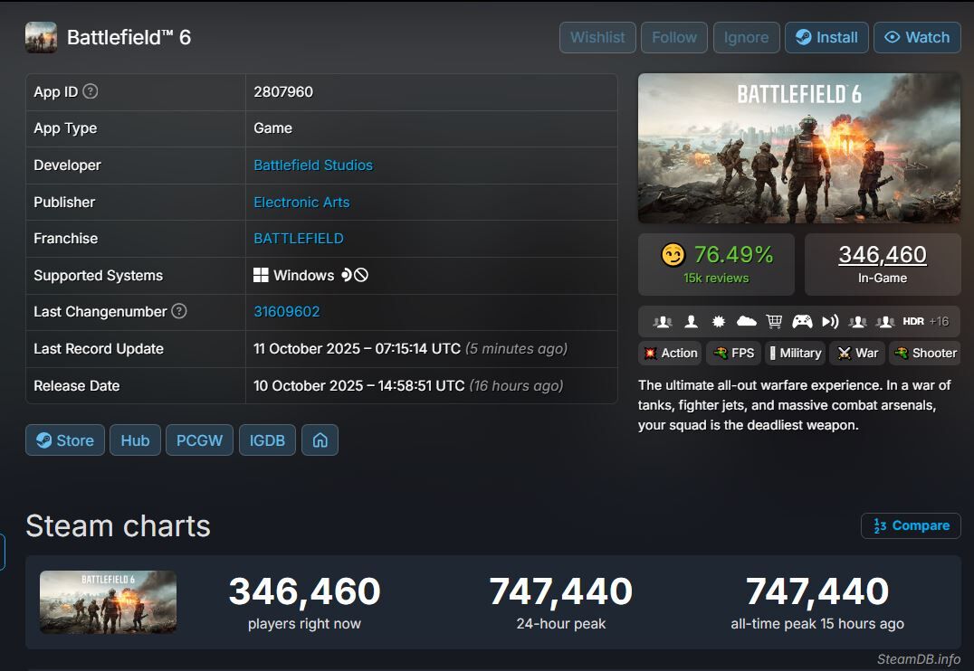 Négy hosszú éve már, hogy megjelent a legutóbbi rész, így minden bizonnyal nagyon sokan várták, hogy megjelenjen a Battlefield 6, amely a tegnapi napon késő délután elérhető lett PC-re, PlayStation 5-re és Xbox Series X/S-re. Várható volt a nagy érdeklődés, ám végül olyan sokan vetették rá magukat a játékra, hogy hosszú percekig kellett várni minden platformon, hogy bejussanak a játékosok csak a menübe. Bár a konzolos kiadásokról nincs kézzelfogható adat, a PC-s kiadáson (Steam) látszik, hogy miért történt mindez. A legújabb résszel ugyanis a minap 747 440 fő játszott egyszerre. Ez több mint a nyílt bétát kipróbálók száma, az összes korábbi Battlefield számait maga mögé utasította, sőt a Steam történelmének legtöbbet játszott játékainak dobogós helyén van a Counter-Strike 2 és a PUBG: Battlegrounds mellett. (Már amennyiben az FPS-eket nézzük)