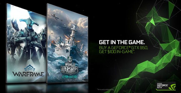 A friss promóció keretében a GeForce GTX 950 jelzésű kártyához, illetve a GeForce GTX 950M mobil megoldáshoz egy 100 dolláros kupon jár, ami 50-50 dollár értékű játékbeli fizetőeszközt jelent az alábbi kettő, amúgy F2P (free to play) alkotásban: Warframe és World of Warships.