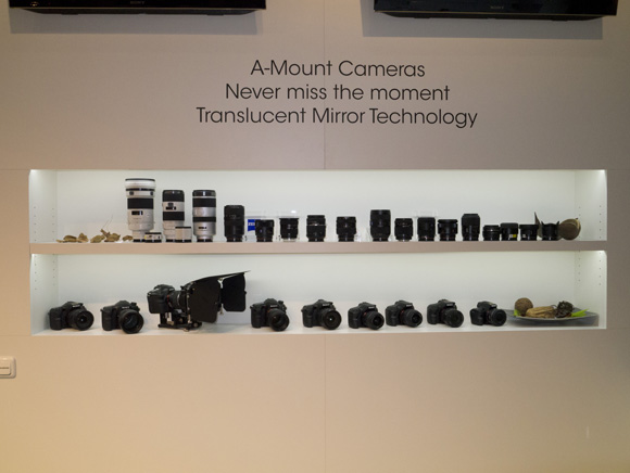 A sajtóműsor után nyakunkba vettük a kiállítást, hogy annak egyik végéből, ahol a tájékoztatók zajlottak, a másikba loholjunk, hogy a Panasonic épülő standján megtekintsük és végre kézbe is vehessük a képeken fantasztikusan jól festő (ez persze ízlés kérdése) GH3 vázat. Útközben összetalálkoztunk a többi gyártó legújabb termékeivel, így –természetesen - ezeknél is elidőztünk. A sorban az első a Sony harctere volt, ahol a háttérmunkálatok ellenére szívesen láttak minket és élőben is végre szemügyre vehettük a nem olyan rég bejelentett NEX-6 és SLT-A99 fényképezőgépeket. Mellettük lencsevégre kaptuk a jelenlegi Sony Alpha bajonettes objektív-felhozatalt és a NEX készülékek teljes sorát.