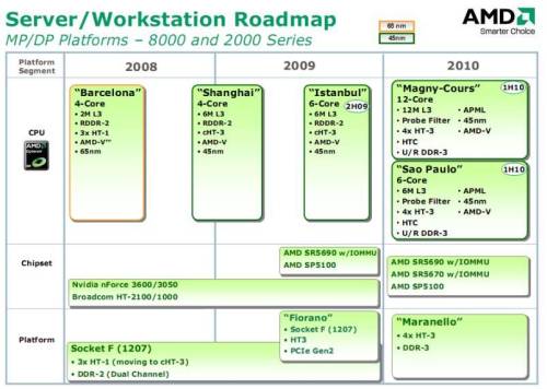 A frissen megjelent útitervben minimális változások vannak a korábban közölt információkhoz képest. A Shanghai kódnevű processzor megjelenése továbbra is az évvégi időszakra van időzítve. Az AMD első, 45 nm-es csíkszélességen készülő CPU-ja az elődhöz hasonlóan szintén négy magot tartalmaz, de kisebb architekturális változtatásokkal növelik az egy órajel alatt végrehajtható műveletek számát. Emellett kommunikációra koherens HyperTransport 3.0 linket fog használni a várhatóan 6 MB méretű harmadszintű gyorsítótár mellett.