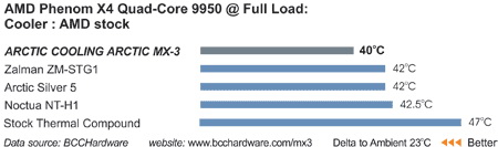Állagát tekintve könnyen kezelhető, igen vékony rétegben is szétteríthető a chipek felületén. Emellett nem folyik és nem is szárad ki az idő előrehaladtával, így tartós használatra is alkalmas észlelhető teljesítménycsökkenés nélkül. Az Arctic Cooling új prémium hővezető pasztájának 4 grammos kiszereléséért 9 eurót kér. A gyártó egy összehasonlító tesztet is készített más cégek termékeivel együtt, ami az alábbi ábrán látható: