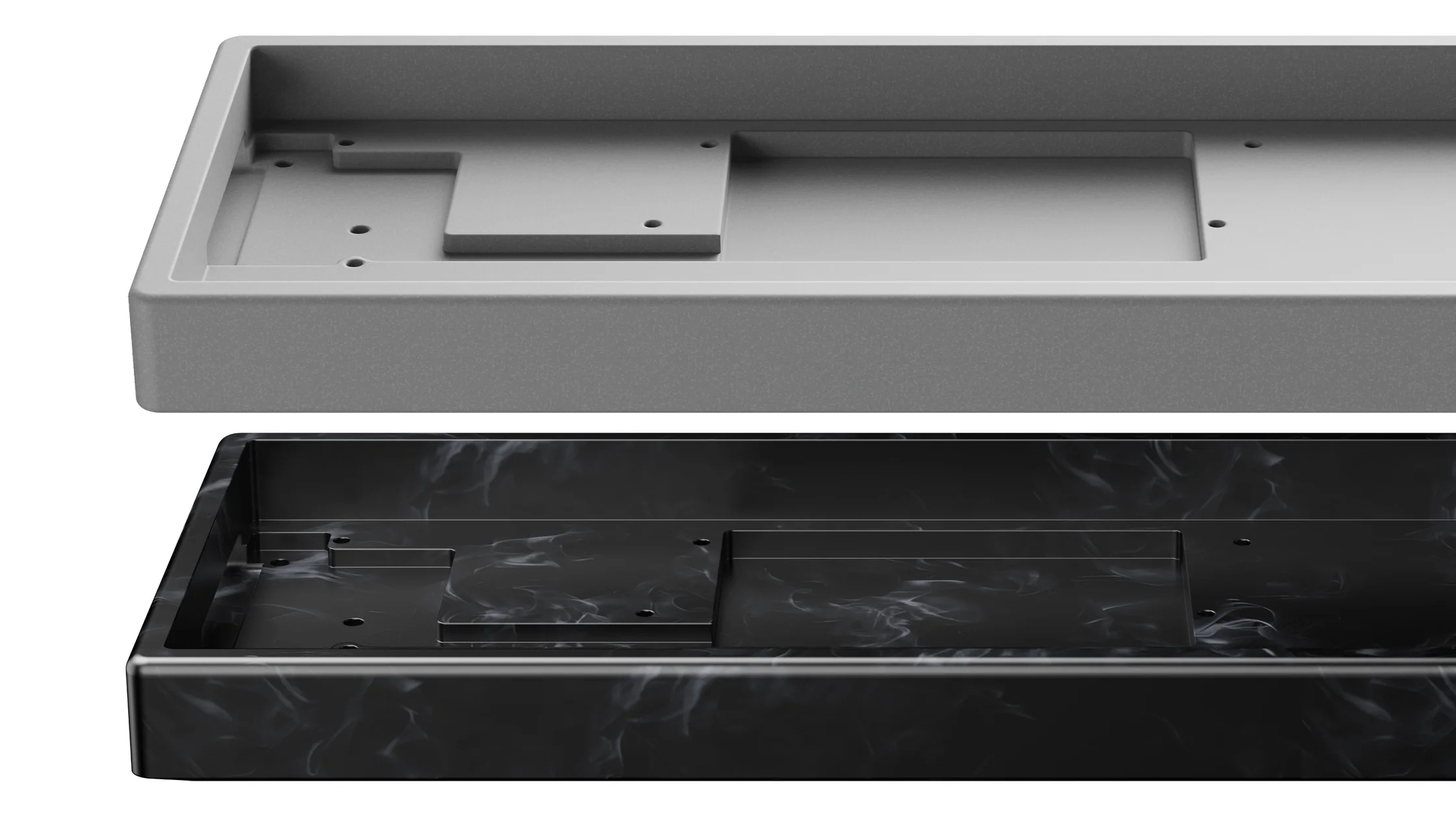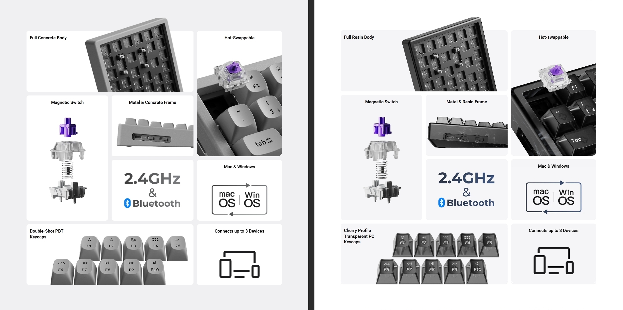 Míg az előbbi típus készülékháza természetes textúrázású, kőszerű tapintású betonkompozitból (322,13 x 132,13 x 27,39/35,92 mm, 1743 gramm), addig az utóbbié márványhatású gyantából (321,13 x 131,3, 27,06/34,91 mm, 1240 gramm) van, de mindkét jószág konstrukcióját fémmel erősítették meg. Az US ANSI kiosztású, 75 százalékos kivitelben feszítő páros tagjai ugyanarra a 256 kB fedélzeti memóriával megtoldott MCU-ra és TMR technológiára épülnek, mint a múltban már körbejárt, hagyományos verzió, ezért a szócséplés helyett tételesen tárgyaljuk a főbb jellemzőiket;