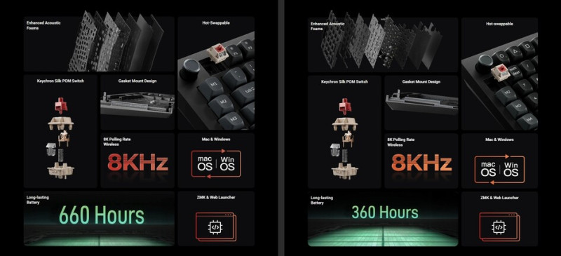 A következő két újdonság a plasztikházas V Ultra 8K termékcsaládot képviseli, aminek megkülönböztető tulajdonsága a vezetékmentes üzemre/energiahatékonyságra kihegyezett ZMK firmware implementálása, a 8000 Hz-es polling rate támogatása, a V Max sorozat három csillapítórétegének ötre növelése és a cég márkajelzését viselő, valószínűleg Gateron által készített Silk POM Red (lineáris, 45 gf, 4/2 mm), Silk POM Brown (enyhén taktilis, 55 gf, 4/2 mm), valamint Silk POM Banana (közepesen taktilis, 57 gf, 3,4/2 mm) kapcsolók használata.