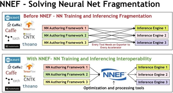 A legfontosabb tényező, hogy végleges állapotba került az NNEF (Neural Net Exchange Format) 1.0-s szabvány, amely az első egységes neuronháló fájlformátum. Ezt a gépi tanulás piaca igen régóta várja, hiszen komoly szerepe lehet abban, hogy megszüntesse a szegmensben jelenleg uralkodó fragmentációt. Mint ismeretes, ma komolyan korlátozza az ipar fejlődését a tréning és a dedukció szakaszok közötti interoperabilitás hiánya. Jelenleg kifejezetten problémás ez a terület, ugyanis a különböző, neuronhálók létrehozását biztosító keretrendszereknek az összes elérhető gyorsítóra különálló támogatást kell írni. Ez nagyrészt amiatt van így, mert nincs az iparon belül megegyezés a hálózat formai szemantikáiról, a struktúrájáról, az adatformátumokról, illetve a sűrűn használt operációkról. Ezáltal minden keretrendszer eltérő ebből a szempontból, és egyedi hardveres támogatást kell tervezni a dedukció szakaszára is.
