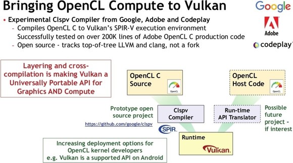 Végül lényeges bejelentés, hogy kezd körvonalazódni az OpenCL jövője. A Khronos Group alapvetően két problémát érzékel a rendszerrel kapcsolatban. Az egyik, hogy az OpenCL nem érhető el mindenhol. Ez igazából nem lesz másképpen, túl komplikáltak az API igényei ahhoz, hogy például az Androidon megvesse a lábát. Ugyanakkor számos szoftvercég épít az OpenCL-re, ami azért baj, mert a már megírt OpenCL C kódokat nehezen tudják Androidra mozgatni. Ezt a problémát a Khronos Group úgy kezelné, hogy a Vulkan futtatási környezetet tennék egyre inkább alkalmassá arra, hogy az OpenCL C kódokat átfogóan támogassa. Erre van többek között a Clspv fordító, ami már megoldja a kódok egy részének futtathatóságát egy szabványos Vulkan implementáción, de később ez még fejlődni fog. A cél itt az, hogy a korábban OpenCL-t választó szoftverfejlesztők viszonylag kis befektetéssel is újra tudják hasznosítani a már megírt OpenCL C kódjaikat egy olyan platformokon, ahol OpenCL API hivatalosan nincs, de Vulkan pont van. Alternatív lehetőség a futtatási időben történő fordítás, de ez egyelőre még képlékeny, viszont van realitása, így érdeklődés mellett a Khronos Group nem zárkózik el a megvalósításától.