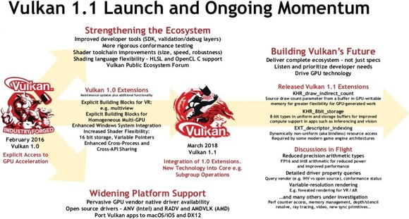 A grafikus API-k tekintetében a Khronos Group lényeges bejelentéssel nem élt, de a Vulkan esetében folyamatos tárgyalások vannak az újításokkal kapcsolatban. Jelen pillanatban az FP16 és az INT8 operációk támogatásának teljes szabványosítása jelenti a fő célt, ugyanis bizonyos újabb hardverek már alkalmasak ezek végrehajtására. Emellett persze számos potenciális újításra vonatkozóan zajlanak tárgyalások, többek között a sugárkövetésre is, de az API-ban történő szabványos elérhetőség még nagyon messze van. Ebből a szempontból a Khronos Group eléggé lemaradt a Microsoft mögött, hiszen a DirectX Raytracing, a Direct 12 sugárkövetésre vonatkozó szabványos kiegészítése az év végén elérhető lesz az új Windows 10 frissítésben. A Vulkan persze így sem maradt teljesen sugárkövetés nélkül, hiszen már hozzáférhető az AMD saját implementációja, de ez nem tekinthető szabványosnak, akkor sem, ha elméletben gyártófüggetlen.
