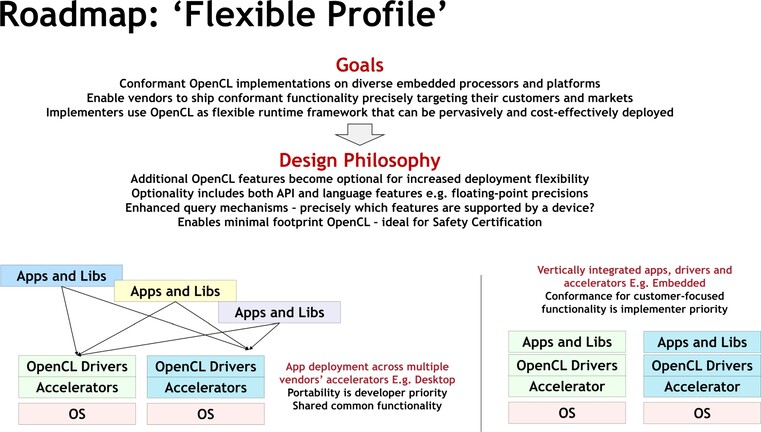 A jövőt tekintve a Khronos Group lényeges tervekkel rendelkezik, és ezeket az új dizájnfilozófiának köszönhetően könnyebb is lesz megvalósítani. A következő OpenCL-ben az egyik komoly újítás az úgynevezett flexibilis profilozás lesz, ami lehetővé teszi a gyártók számára, hogy az implementációjukat tényleg nagyon a hardverükhöz szabják. Ennek leginkább a beágyazott termékek piacán lesz értelme, mivel olyan profilt tudnak a cégek generálni, amellyel nem szükséges az egyes, amúgy kötelező érvényű követelményeket teljesíteni. Ergo, ha a hardvere esetleg nem tudna megfelelni az OpenCL minimum követelményeinek, akkor a profil módosításával megfeleltethető, vagy ha esetleg vannak olyan kötelezően támogatandó funkciók, amelyeket az adott piacon biztos nem használnának, akkor azok is kivehetők. Utóbbi az egész szoftveres hátteret segíti, hiszen kevésbé lesznek komplexek a meghajtók, a hitelesítés is egyszerűbb lesz, és hasonlók.