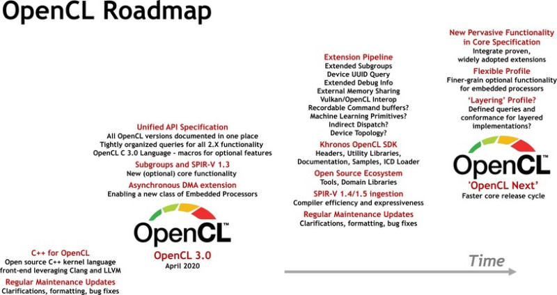 Az OpenCL 3.0 esetében egyelőre az előzetes specifikáció van kész, és most kezdődik az implementációk tesztelésére vonatkozó munka, aminek a része a véglegesítés is. Ez valószínűleg pár hónapon belül lezajlik, mivel nagyon sok szempontból felhasználhatók a meglévő kódbázisok, a gyártók számára sem lesz túl nehéz OpenCL 3.0-s implementációval előállni, ha már rendelkeznek legalább OpenCL 1.2-t támogatóval. Ilyen formában a specifikáció véglegesítése sem ütközhet majd túl sok problémába.